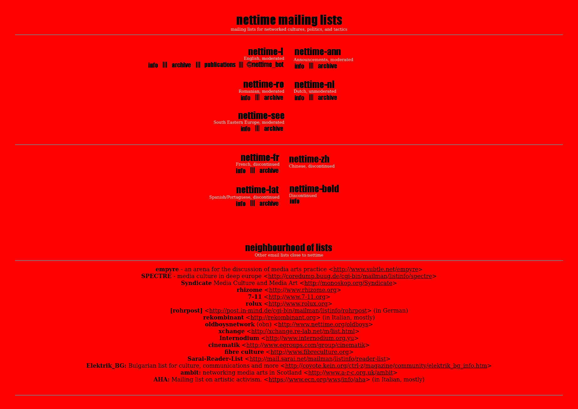 <nettime> ist nicht nur eine Mailingliste, sondern der Versuch, einen internationalen, vernetzten Diskurs zu formulieren, der weder eine herrschende Euphorie fördert (um Produkte zu verkaufen), noch den zynischen Pessimismus fortsetzt, der von JournalistInnen und Intellektuellen in den „alten“ Medien verbreitet wird, die über „neue“ Medien verallgemeinern, ohne deren Kommunikationsaspekte klar zu verstehen. Wir haben Bücher, Reader und Websites in verschiedenen Sprachen produziert und werden dies auch weiterhin tun, damit eine „immanente“ Netzkritik sowohl on- als auch offline zirkulieren kann.
